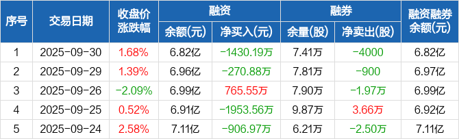 楚江新材:融资净偿还1430.19万元,融资余额6.82亿元(09-30)