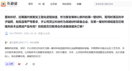 上证报中国证券网讯楚江新材13日在互动平台回答投资者提问时表示,子公司顶立科技可为第一壁材料制造提供钨合金超高温烧结装备、钎焊焊料非晶合金及工艺支持,并已向相关单位供货。公司始终关注核聚变领域技术、动态与需求,未来,公司将持续在核聚变领域推进业务落地、加大资源投入、深化前瞻布局。