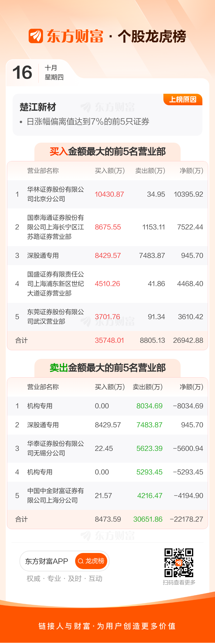 交易所2025年10月16日公布的交易公开信息显示,楚江新材因成为日涨幅偏离值达到7%的前5只证券、连续三个交易日内,涨幅偏离值累计达到20%的证券上榜。楚江新材当日收报12.72元,涨跌幅10.03%,偏离值10.57%,换手率21.43%,成交额42.77亿。异常期间10月14日至10月16日,期间涨幅23.62%,累计偏离值24.55%,区间成交额86.32亿。