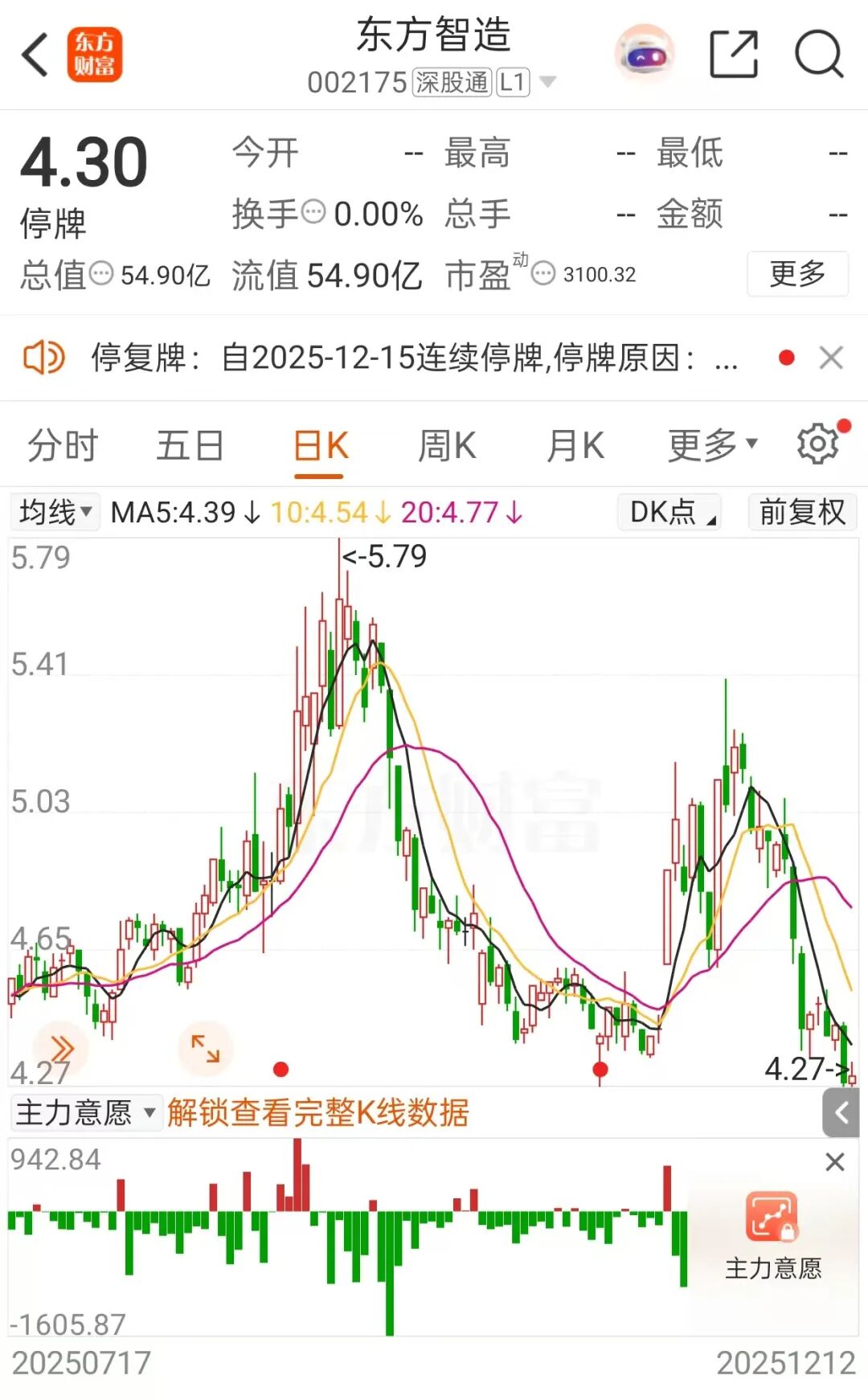 截至停牌前最后一个交易日(12月12日),东方智造报4.30元/股,总市值为54.90亿元。