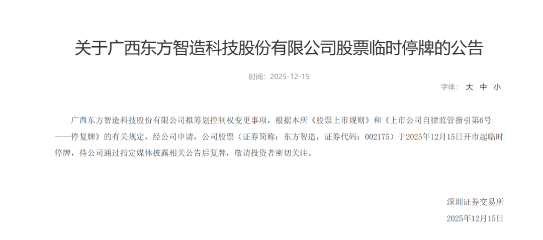 12月15日盘前,深交所公告称,东方智造(证券代码:002175)拟筹划控制权变更事项,根据有关规定,经公司申请,公司股票于12月15日开市起临时停牌。