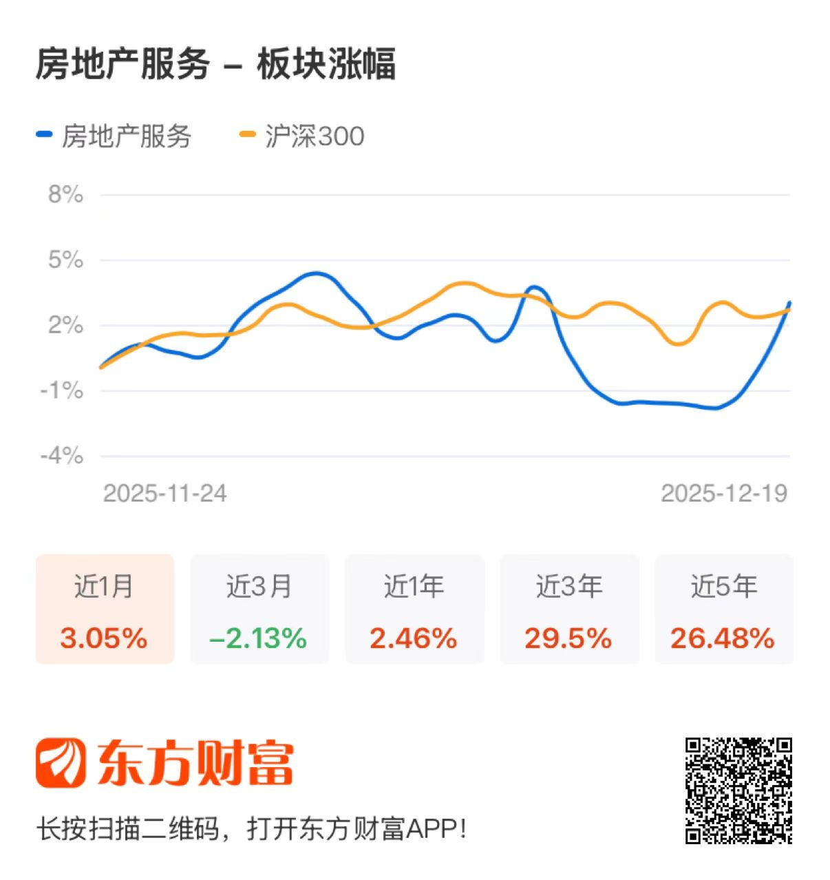 广发证券表示,本周板块经历情绪巨震,被动政策指引将行情方向交由长期经济表现及突发政策。25年50周,SW房地产板块下跌2.6%,跑输沪深300指数2.5pct。在30个申万行业表现中,本周SW房地产板块表现排在90%分位(27/30),过去4周平均处于83%分位数,连续一个月处于各行业尾部位置。本周年底两会表态,对于地产后续行情走强较难起到显著的支撑,叠加年底基本面表现加速下行,主流开发类企业估值仍面临极大的压力。未来一段时间港房、物业及商业板块的相对排序提前。