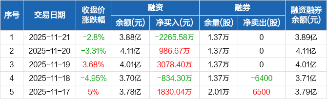 成飞集成:融资净偿还2265.58万元,融资余额3.88亿元(11-21)