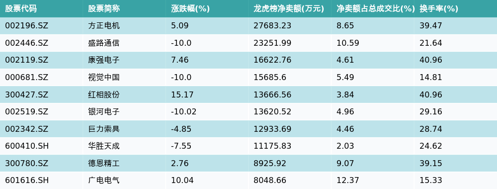 21智讯1月19日电,南财金融终端数据显示,因当日异动登上龙虎榜的个股中,龙虎榜中资金净流出最多的前三位分别是方正电机(002196.SZ)、盛路通信(002446.SZ)与康强电子(002119.SZ)。其中排名第一的方正电机被净卖出2.77亿元,占总成交金额的8.65%。方正电机收盘上涨5.09%,换手率为39.47%。净卖出额前10个股详情见下图: