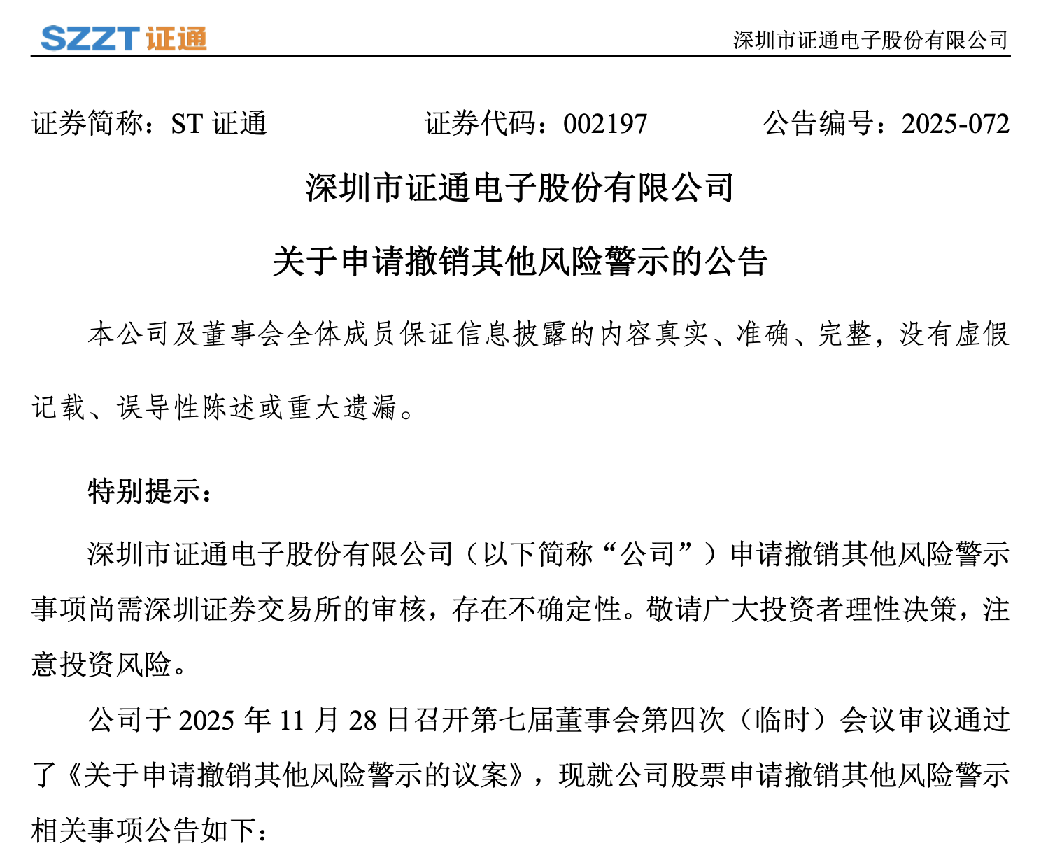 11月28日,ST证通(002197)公告称,公司于当日召开第七届董事会第四次(临时)会议审议通过了《关于申请撤销其他风险警示的议案》。目前,公司申请撤销其他风险警示事项尚需深圳证券交易所的审核,存在不确定性。