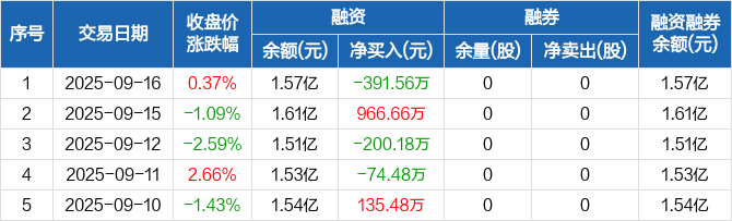九鼎新材:融资净偿还391.56万元,融资余额1.57亿元(09-16)