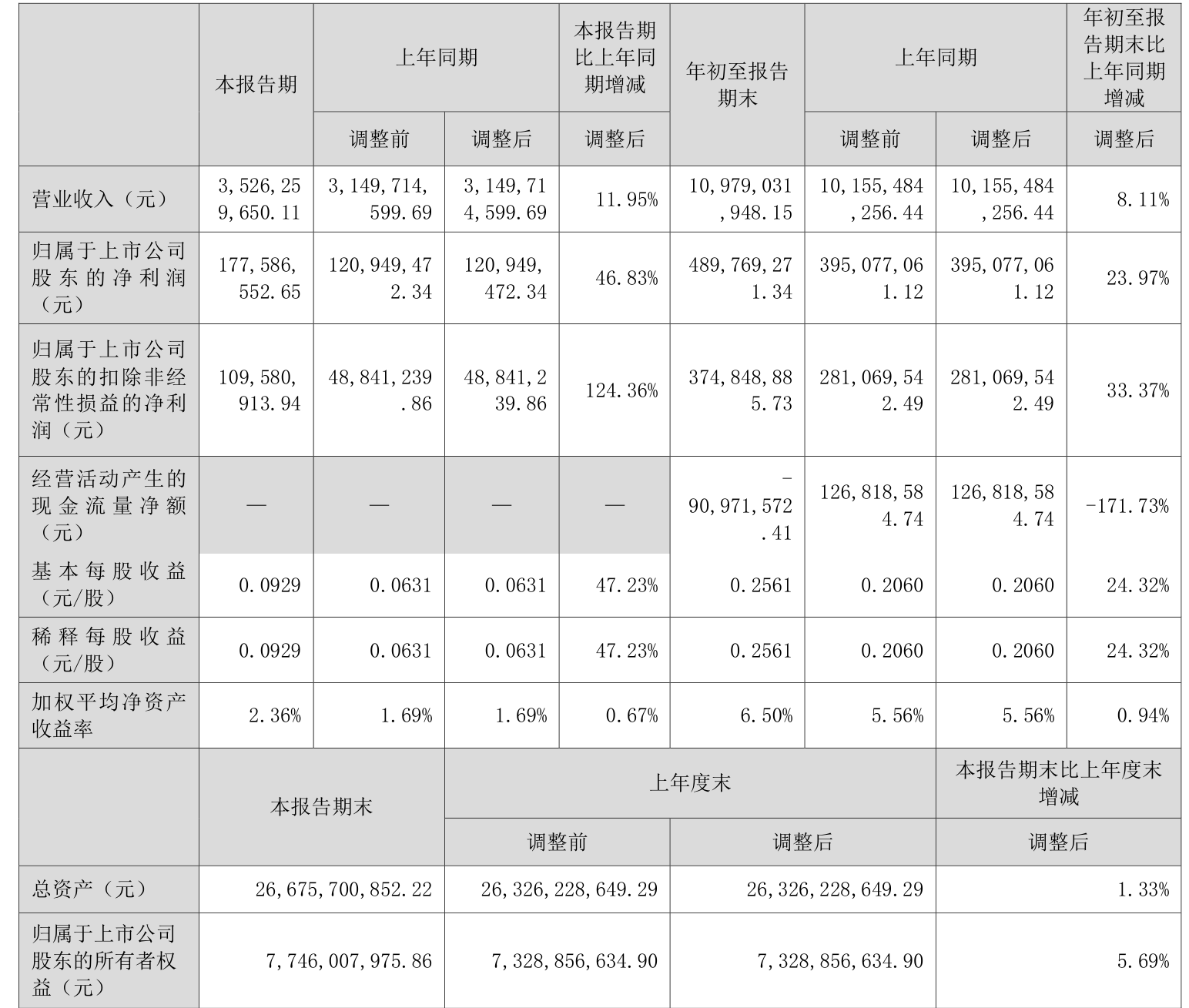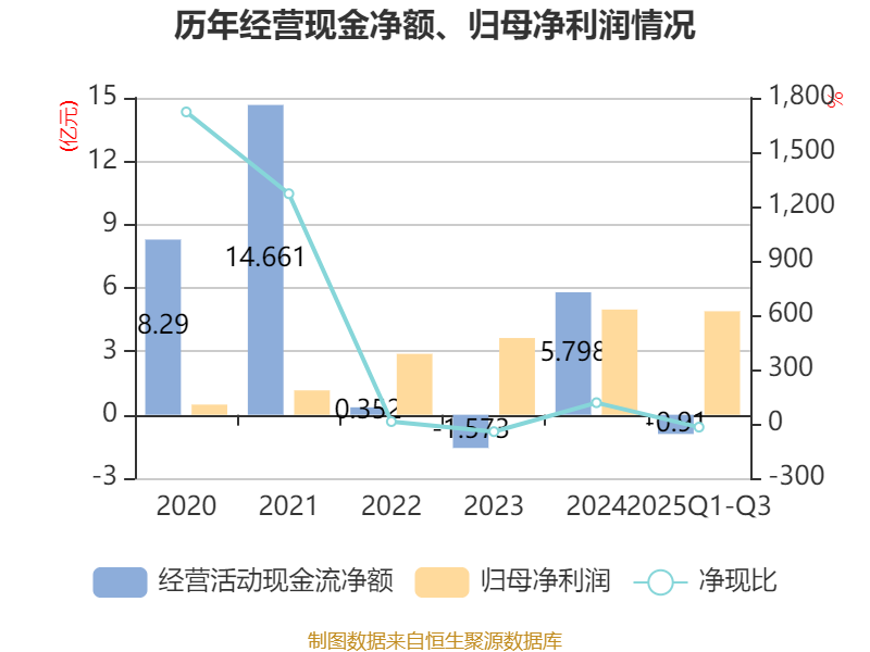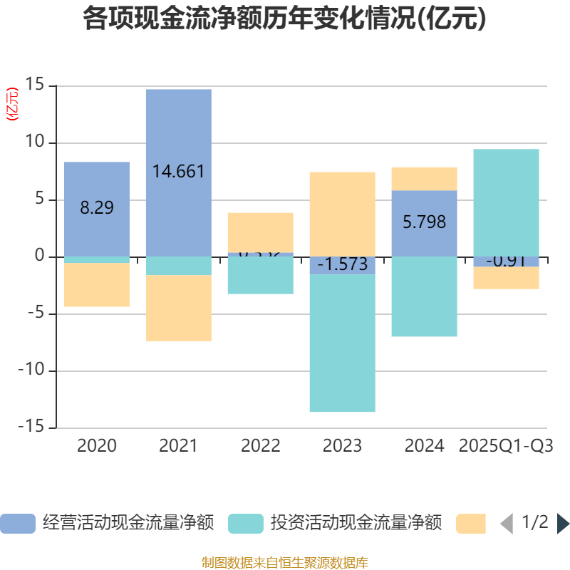 2025年前三季度,公司经营活动现金流净额为-9097.16万元,同比减少2.18亿元;筹资活动现金流净额-1.95亿元,同比减少4.12亿元;投资活动现金流净额9.42亿元,上年同期为-6.19亿元。