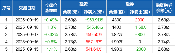 海利得:融资净偿还953.91万元,融资余额2.63亿元(09-19)