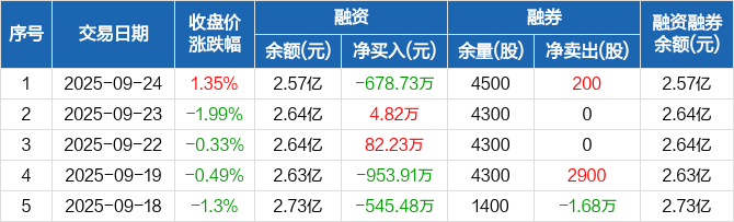 海利得:融资净偿还678.73万元,融资余额2.57亿元(09-24)