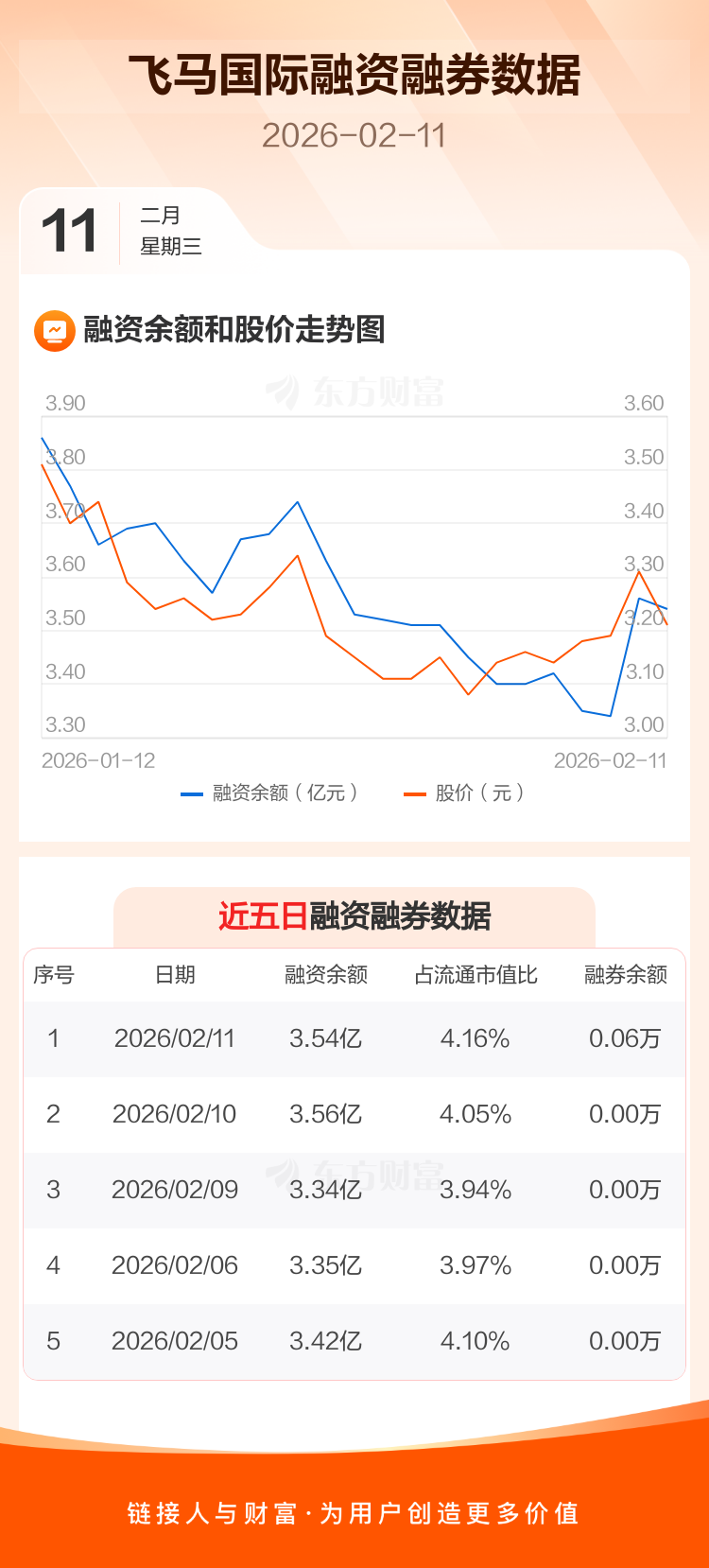 交易所最新数据显示,飞马国际于2026年2月11日获融资买入2431.36万元,融资偿还2578.61万元,当日融资净偿还147.25万元。目前,该股融资余额3.54亿,占流通市值比例为4.16%。