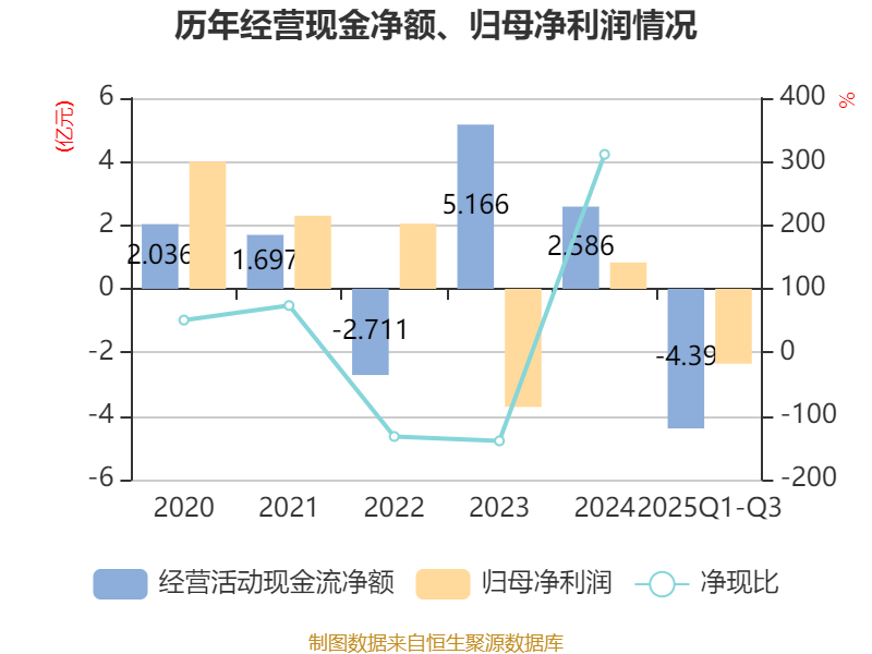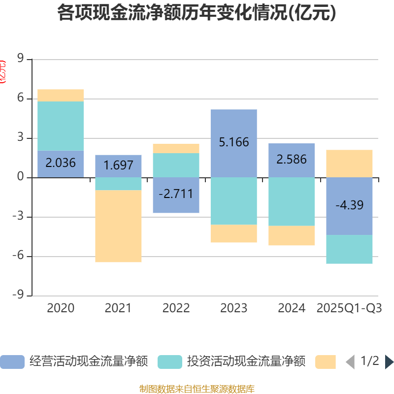 2025年前三季度,公司经营活动现金流净额为-4.39亿元,同比减少1.44亿元;筹资活动现金流净额2.09亿元,同比增加3.13亿元;投资活动现金流净额-2.19亿元,上年同期为-2.76亿元。