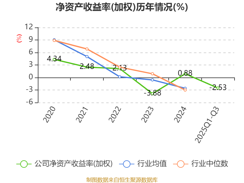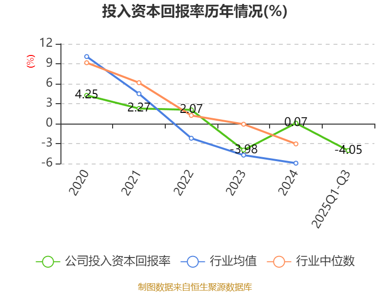 盈利能力方面, 2025年前三季度公司加权平均净资产收益率为-2.53%,同比下降0.72个百分点。公司2025年前三季度投入资本回报率为-4.05%,较上年同期下降0.87个百分点。