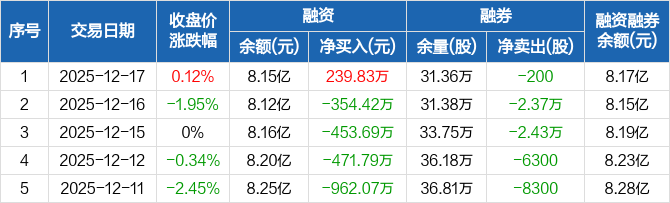 融资方面,当日融资买入2200.72万元,融资偿还1960.89万元,融资净买入239.83万元。融券方面,融券卖出3000股,融券偿还3200股,融券余量31.36万股,融券余额268.76万元。融资融券余额合计8.17亿元。