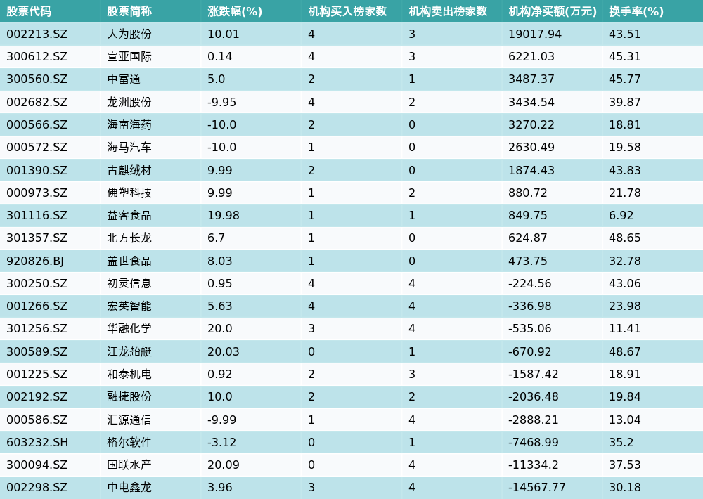 南财智讯11月19日电,南财金融终端数据显示,因当日异动登上龙虎榜的个股中,21只沪深A股龙虎榜出现了机构的身影,机构合计净买入1114.52万元,具体来看,机构净买入11只个股,净卖出10只个股。其中,机构净买入前三分别为大为股份(002213.SZ)、宣亚国际(300612.SZ)与中富通(300560.SZ),详情见下图:机构净卖出的个股中,前三分别为中电鑫龙(002298.SZ)、国联水产(300094.SZ)与格尔软件(603232.SH)。