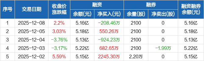 融资方面,当日融资买入5539.34万元,融资偿还5747.81万元,融资净偿还208.46万元。融券方面,融券卖出0股,融券偿还0股,融券余量2100股,融券余额3.5万元。融资融券余额合计5.16亿元。