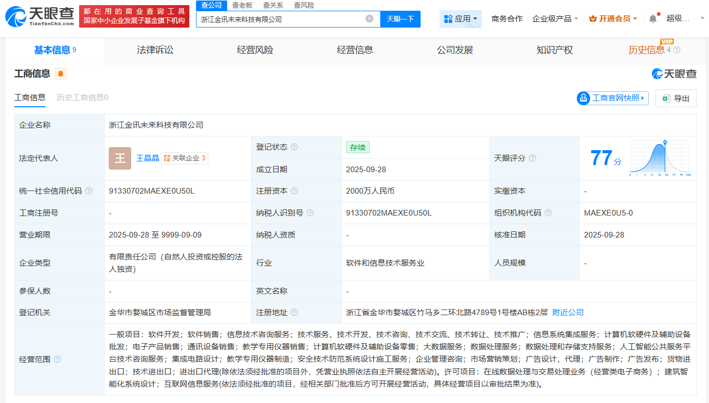 南方财经10月9日电,天眼查App显示,近日,浙江金讯未来科技有限公司成立,法定代表人为王晶晶,注册资本2000万人民币,经营范围包括信息系统集成服务、人工智能公共服务平台技术咨询服务、集成电路设计等。股东信息显示,该公司由浙江讯飞智能科技有限公司全资持股。