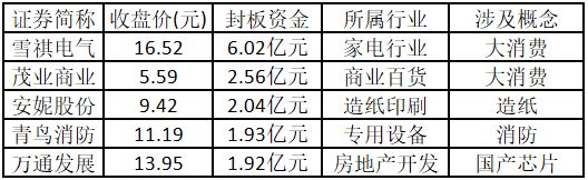 从封板资金来看,今日涨停板个股中,封板资金排名前5的个股包括雪祺电气、茂业商业、安妮股份、青鸟消防、万通发展。