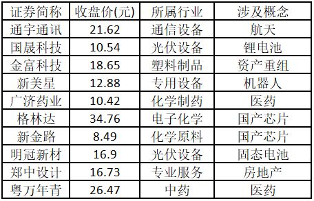 涨停板个股中,股价创出近一年新高的个股有10只(不包括创出历史新高的个股),包括通宇通讯、国晟科技、金富科技、新美星、广济药业、格林达、新金路、明冠新材、郑中设计、粤万年青,具体如下表所示。