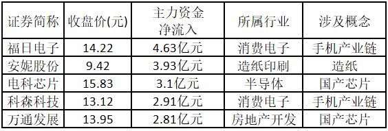 从主力资金来看,今日涨停板个股中,主力资金净流入金额排名前5的个股分别为福日电子、安妮股份、电科芯片、科森科技、万通发展。