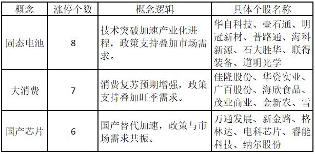 从概念特征来看,今日涨停板个股中,固态电池、大消费、国产芯片概念的个股最多。