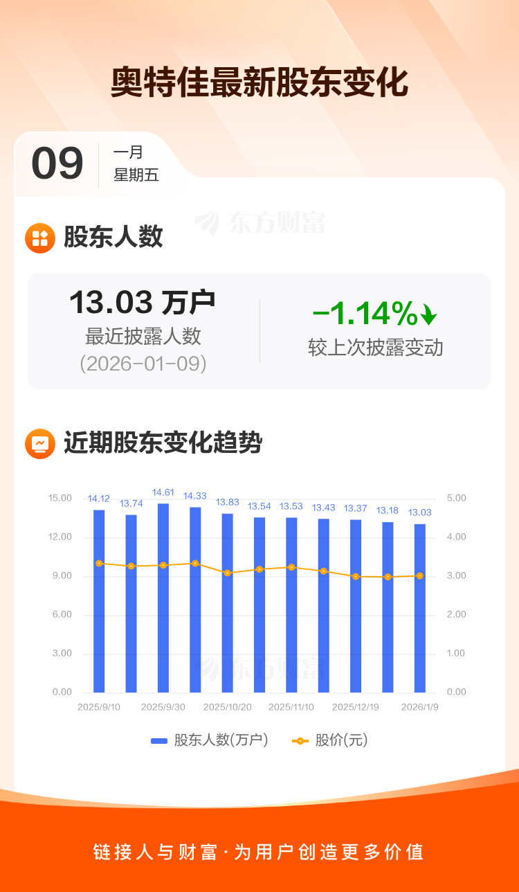 奥特佳:截至1月9日最新股东户数13.03万户,较上期减少1.14%