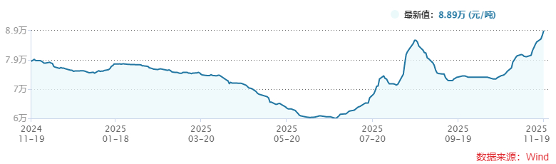 现货方面,今年上半年,碳酸锂价格一度跌破6万元/吨,而后震荡上行。Wind数据显示,11月19日,碳酸锂(99.5%电,国产)报价8.89万元/吨。