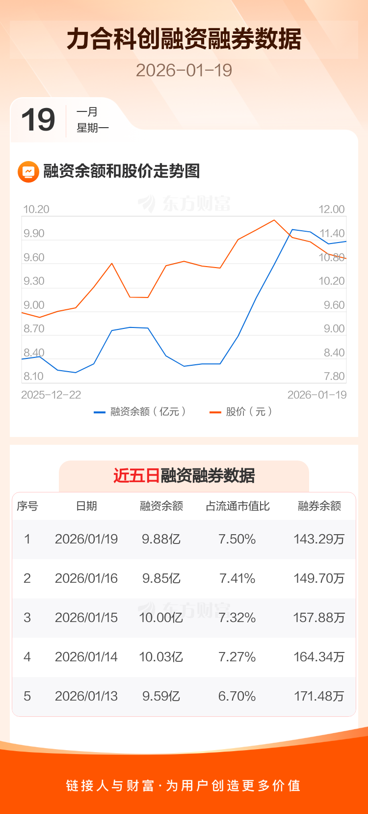 交易所最新数据显示,力合科创于2026年1月19日获融资买入2956.92万元,融资偿还2659.04万元,当日融资净买入297.88万元。目前,该股融资余额9.88亿,占流通市值比例为7.50%。