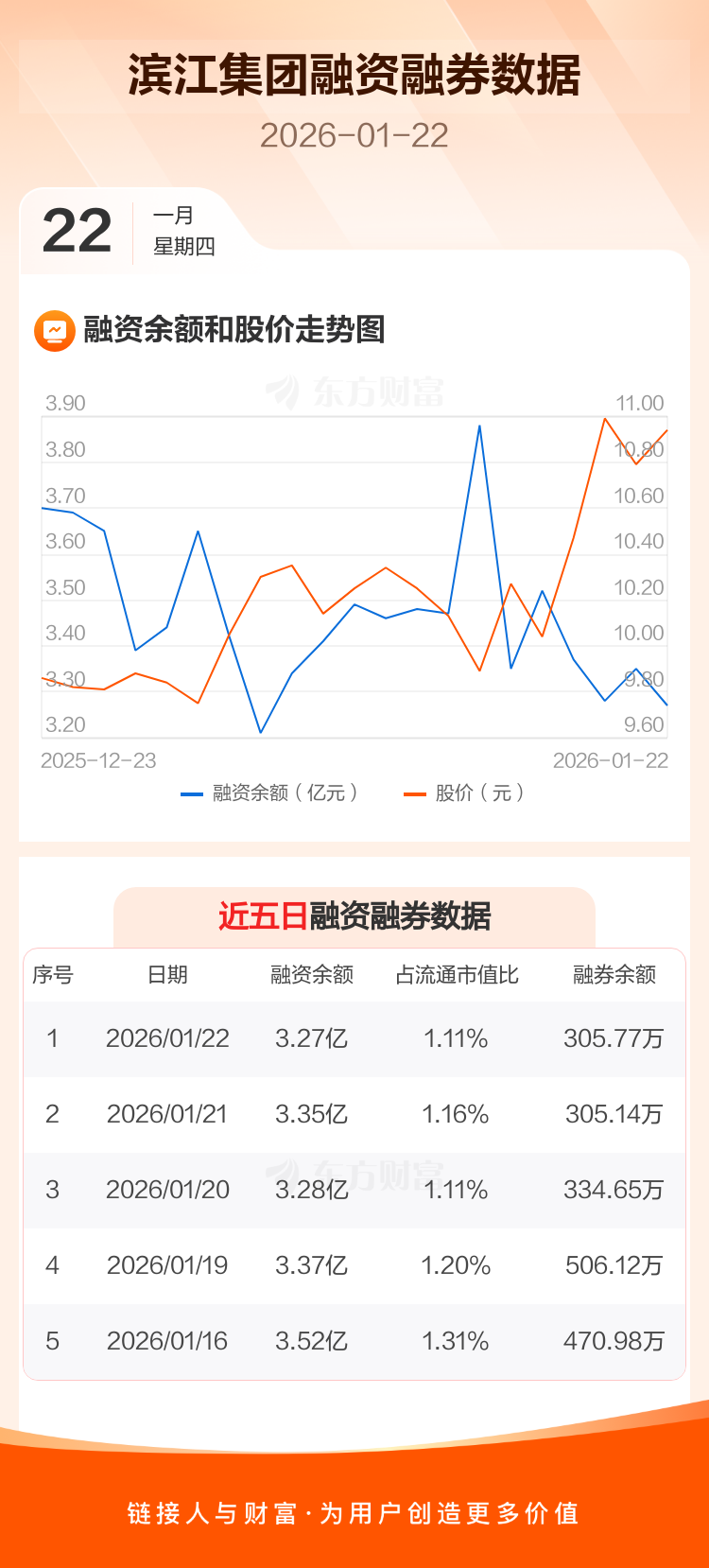 交易所最新数据显示,滨江集团于2026年1月22日获融资买入2257.04万元,融资偿还3129.33万元,当日融资净偿还872.29万元。目前,该股融资余额3.27亿,占流通市值比例为1.11%。