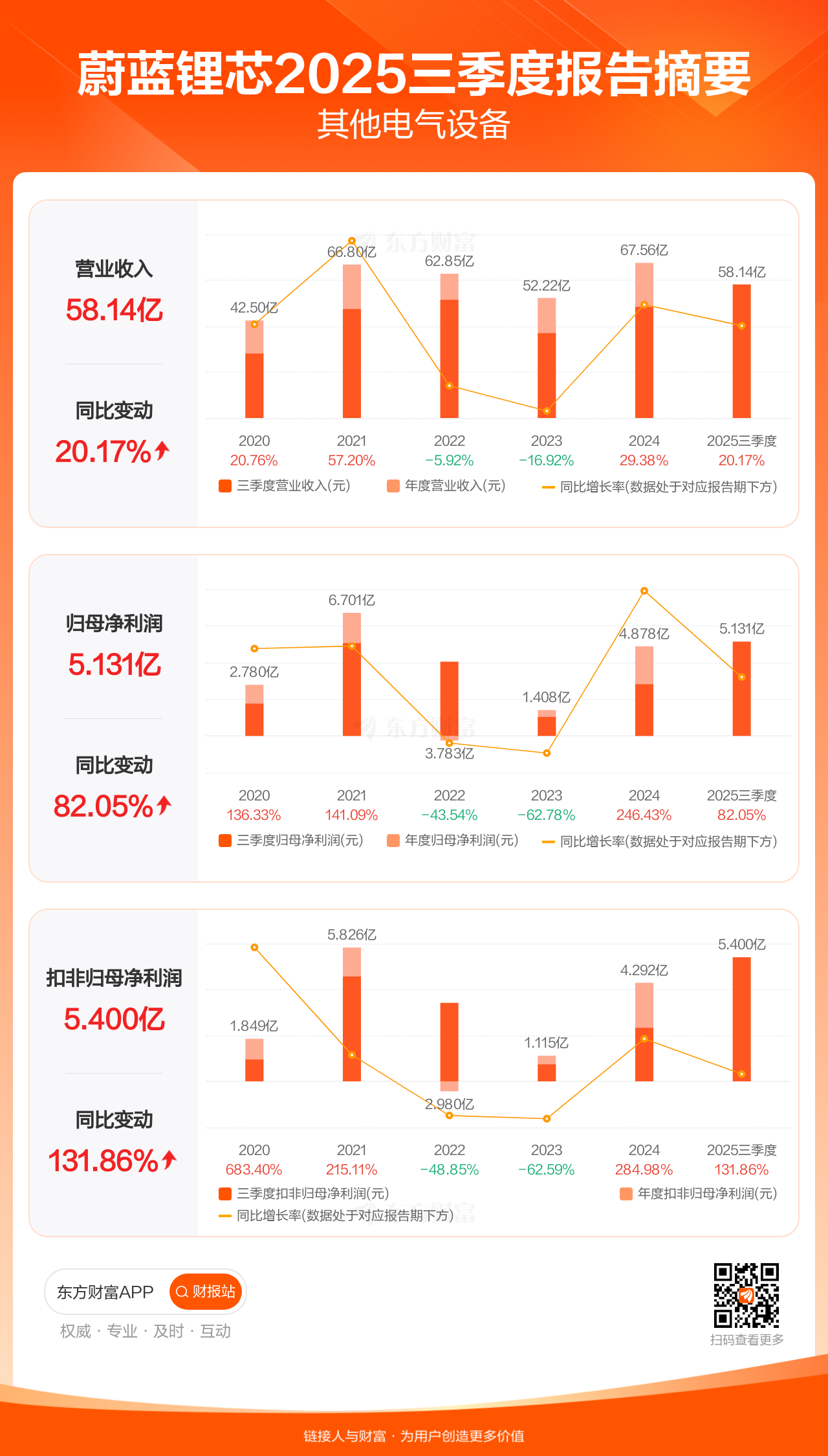 蔚蓝锂芯10月28日发布2025年三季报显示,公司前三季实现营业收入58.14亿元,同比增长20.17%;归母净利润5.13亿元,同比增长82.05%;扣非归母净利润5.40亿元,同比增长131.86%。