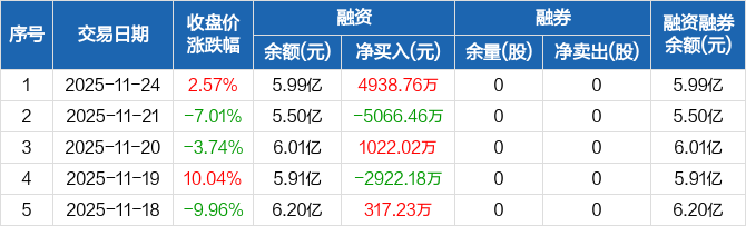 融资方面,当日融资买入1.81亿元,融资偿还1.32亿元,融资净买入4938.76万元。融券方面,融券卖出0股,融券偿还0股,融券余量0股,融券余额0元。融资融券余额合计5.99亿元。