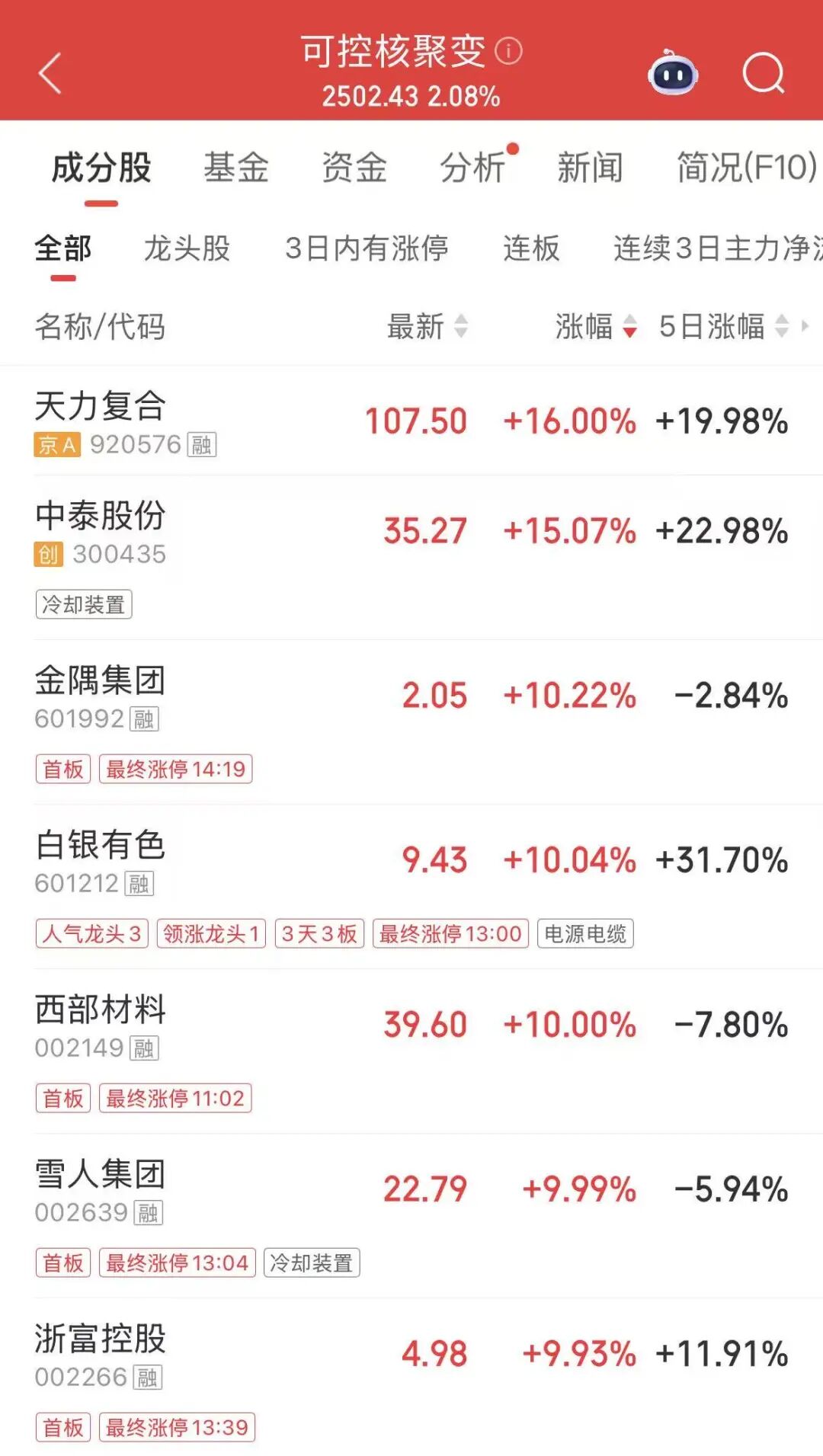 今日午后,可控核聚变板块震荡走高,浙富控股直线涨停;截至收盘,雪人集团、西部材料等涨停。