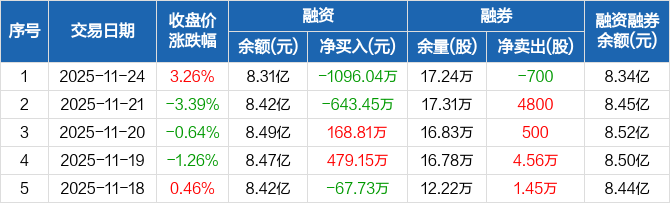 融资方面,当日融资买入1203.17万元,融资偿还2299.21万元,融资净偿还1096.04万元。融券方面,融券卖出4900股,融券偿还5600股,融券余量17.24万股,融券余额294.46万元。融资融券余额合计8.34亿元。