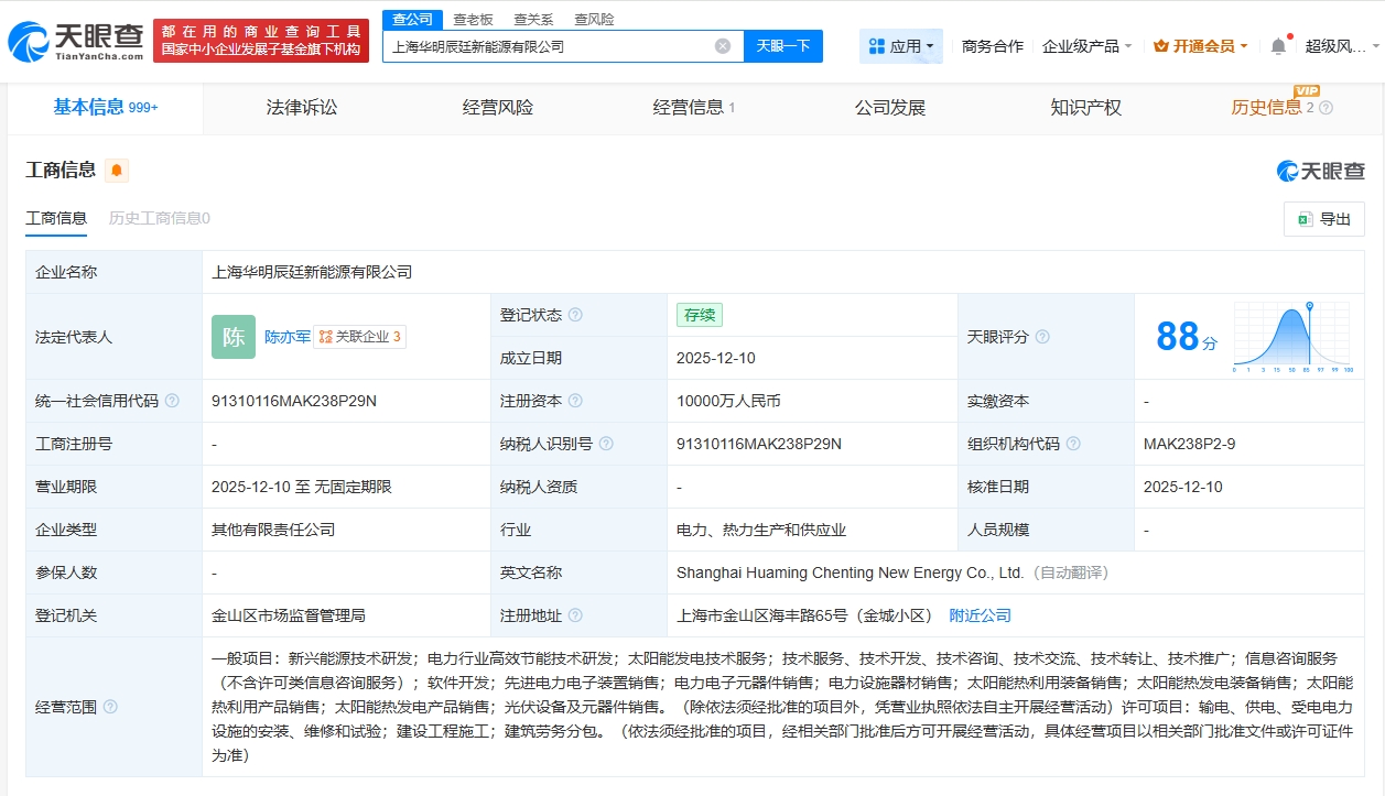 南方财经12月12日电,天眼查App显示,近日,上海华明辰廷新能源有限公司成立,法定代表人为陈亦军,注册资本1亿人民币,经营范围包括新兴能源技术研发、电力行业高效节能技术研发、太阳能发电技术服务等。股权全景穿透图显示,该公司由华明装备(002270)及旗下上海辰廷科技发展有限公司共同持股。