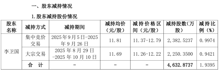 自上次9月19日披露减持公告以来,公司于近日收到李卫国先生出具的《关于减持计划实施完成暨实施结果的告知函》,李卫国先生于2025年9月22日至2025年10月10日期间通过深圳证券交易所大宗交易和集中竞价交易方式累计减持公司股份624.3500万股,占公司总股本比例0.2614%,本次权益变动后,李卫国先生及其一致行动人李兴国先生持股比例由21.0000%减少至20.7386%。