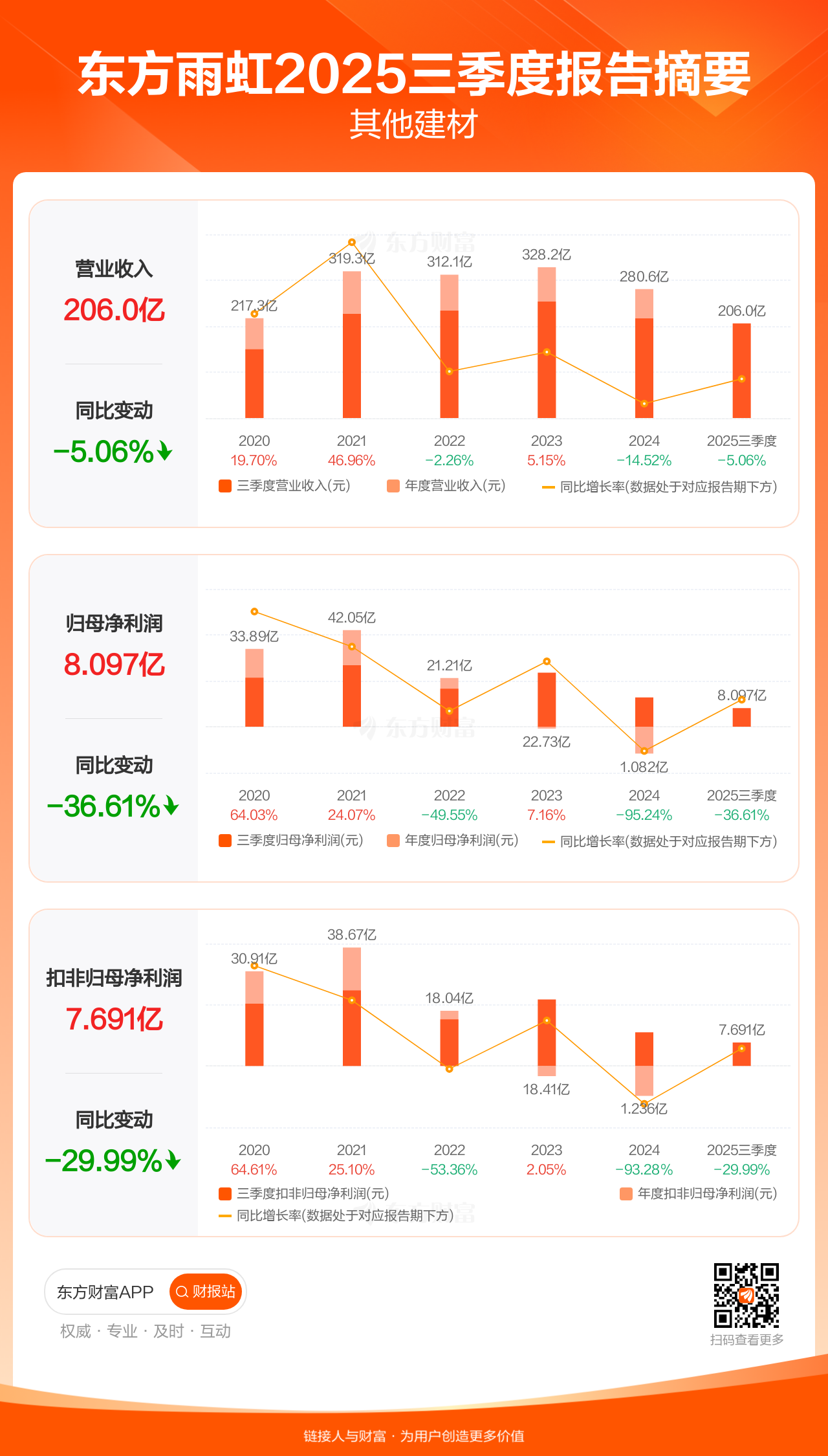 东方雨虹10月28日发布2025年三季报显示,公司前三季实现营业收入206.01亿元,同比下滑5.06%;归母净利润8.10亿元,同比下滑36.61%;扣非归母净利润7.69亿元,同比下滑29.99%。