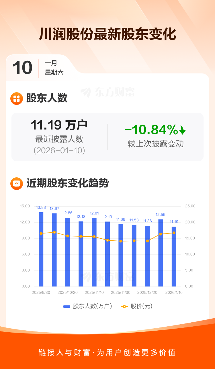 川润股份:截至1月10日最新股东户数11.19万户,较上期减少10.84%