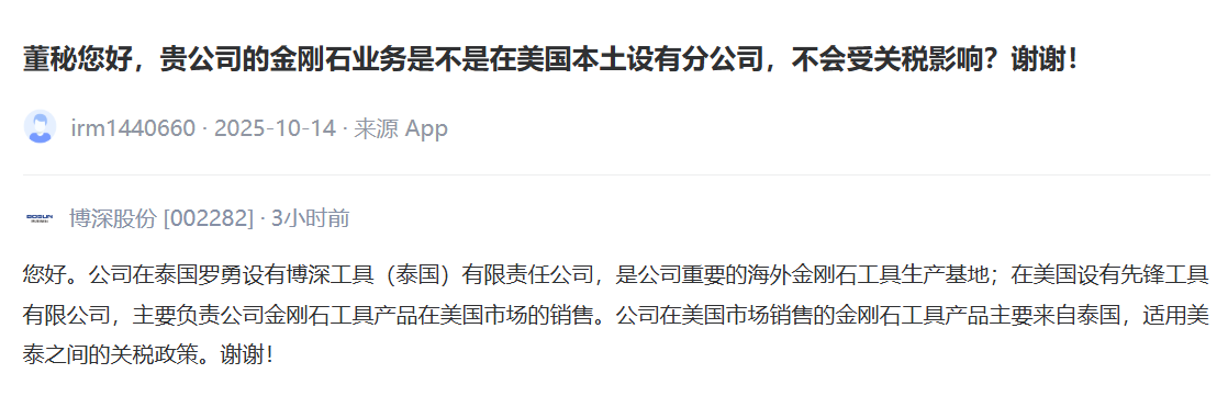 博深股份:在美国市场销售的金刚石工具产品主要来自泰国