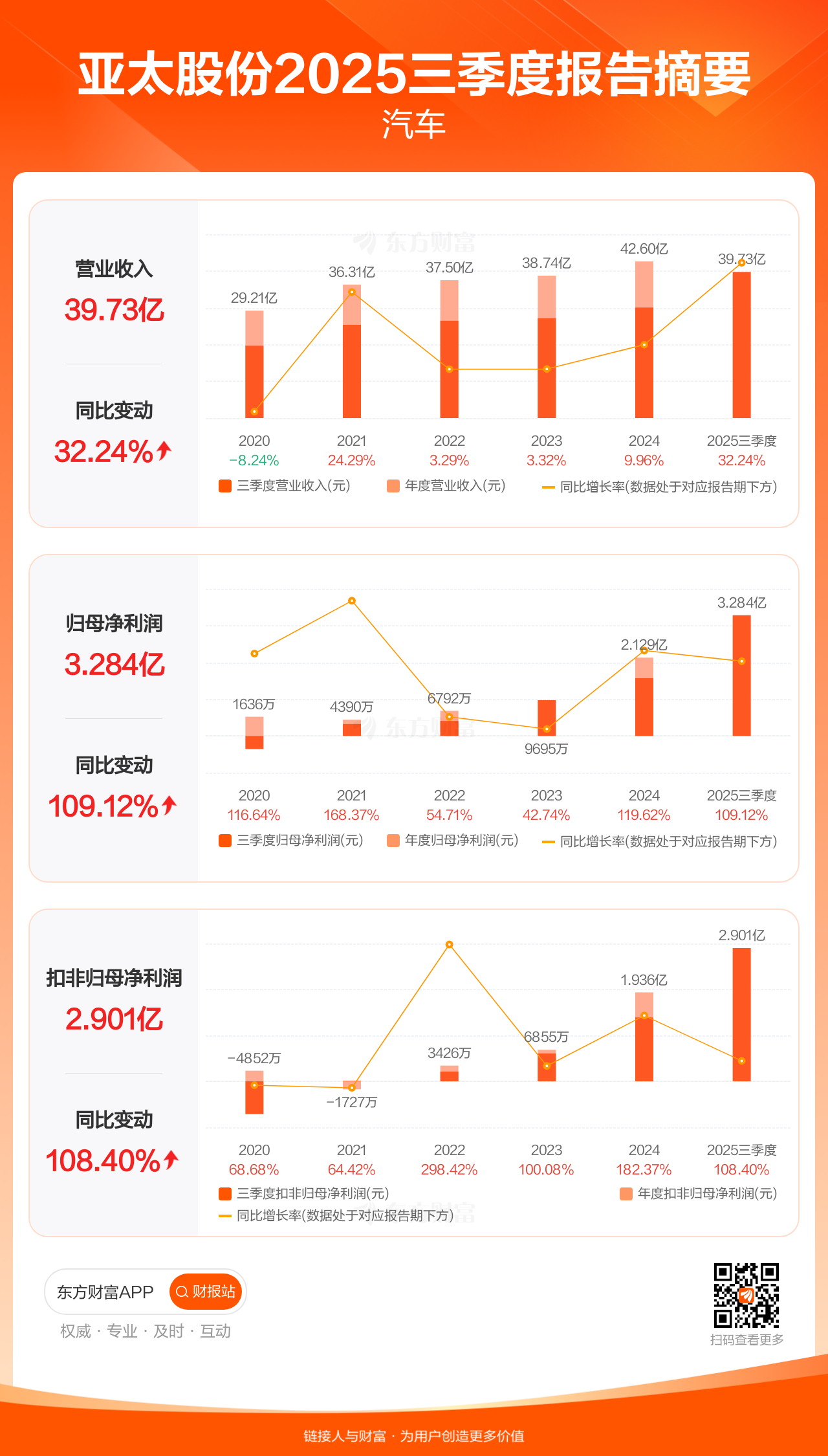 亚太股份10月28日发布2025年三季报显示,公司前三季实现营业收入39.73亿元,同比增长32.24%;归母净利润3.28亿元,同比增长109.12%;扣非归母净利润2.90亿元,同比增长108.40%。