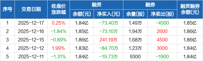融资方面,当日融资买入423.67万元,融资偿还497.07万元,融资净偿还73.4万元。融券方面,融券卖出0股,融券偿还4500股,融券余量1.49万股,融券余额35.77万元。融资融券余额合计1.85亿元。