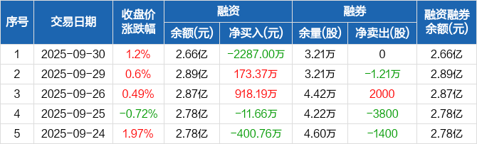 博云新材:融资净偿还2287万元,融资余额2.66亿元(09-30)