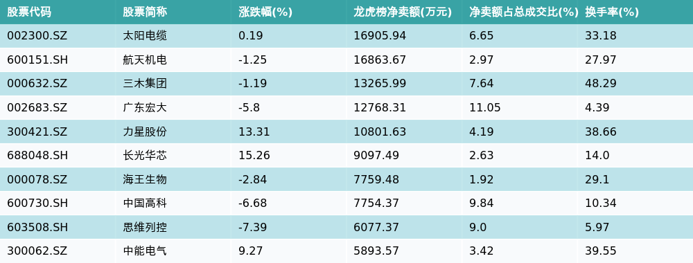 南财智讯12月8日电,南财金融终端数据显示,因当日异动登上龙虎榜的个股中,龙虎榜中资金净流出最多的前三位分别是太阳电缆(002300.SZ)、航天机电(600151.SH)与三木集团(000632.SZ)。其中排名第一的太阳电缆被净卖出1.69亿元,占总成交金额的6.65%。太阳电缆收盘上涨0.19%,换手率为33.18%。净卖出额前10个股详情见下图: