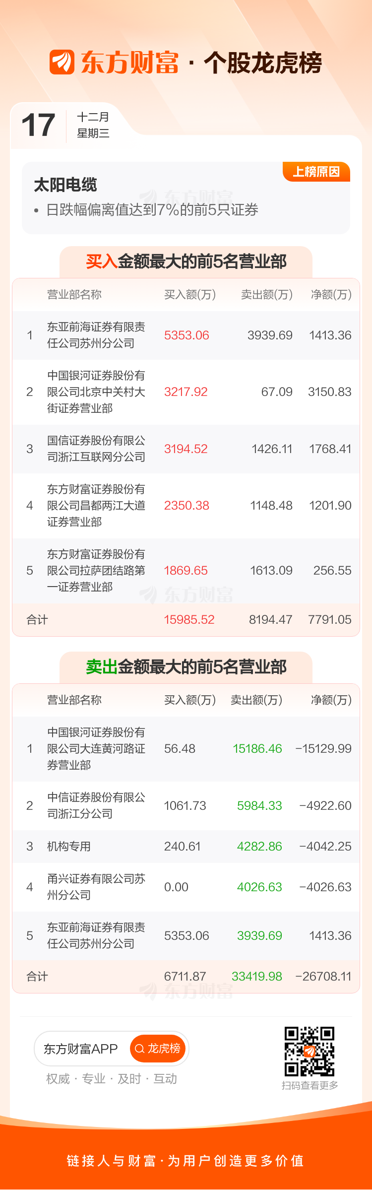 交易所2025年12月17日公布的交易公开信息显示,太阳电缆因成为日跌幅偏离值达到7%的前5只证券上榜。太阳电缆当日收报11.65元,涨跌幅-9.97%,偏离值-11.68%,换手率23.43%,成交额19.98亿。