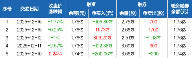 美盈森:融资净偿还105.8万元,融资余额1.75亿元(12-16)