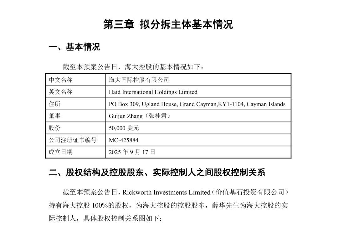 预案显示,海大控股成立于2025年9月17日,距离分拆公告发布仅30天。