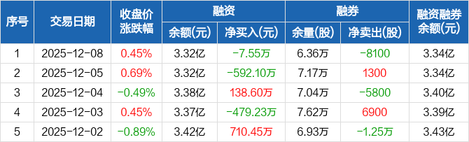 久立特材:融资净偿还7.55万元,融资余额3.32亿元(12-08)