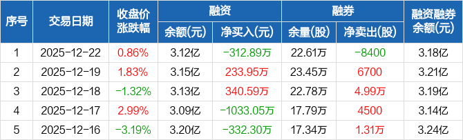 久立特材:融资净偿还312.89万元,融资余额3.12亿元(12-22)