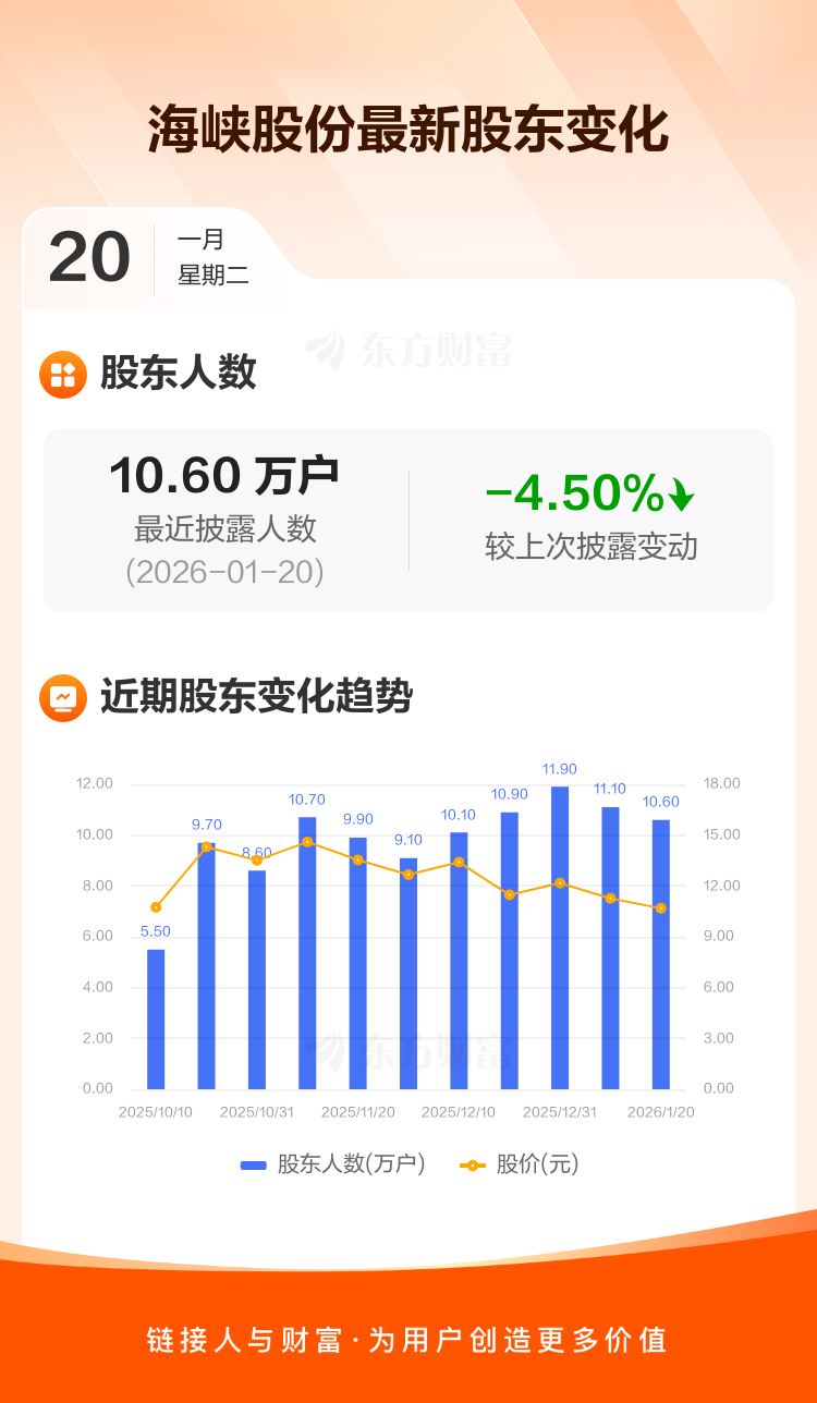 海峡股份:截至1月20日最新股东户数10.60万户,较上期减少4.50%