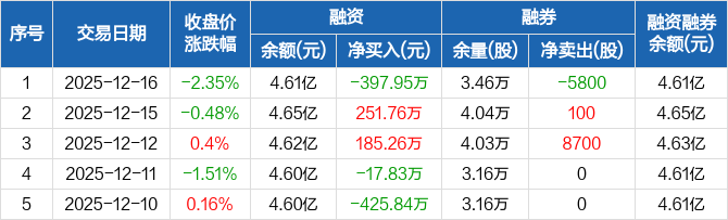 融资方面,当日融资买入764.03万元,融资偿还1161.98万元,融资净偿还397.95万元。融券方面,融券卖出0股,融券偿还5800股,融券余量3.46万股,融券余额41.76万元。融资融券余额合计4.61亿元。