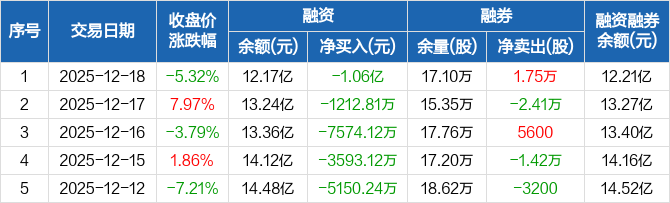 永太科技融资融券信息显示,2025年12月18日融资净偿还1.06亿元;融资余额12.17亿元,较前一日下降8.04%。