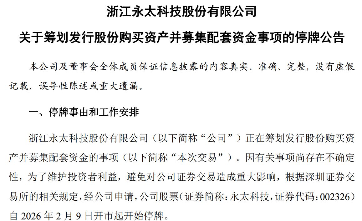 2月8日,永太科技(SZ002326,股价28.77元,市值266.16亿元)公告称,公司正在筹划发行股份购买资产并募集配套资金的事项,股票自2026年2月9日开市起停牌。